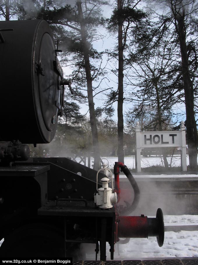| On Boxing Day a "Mince Pie Special", hauled by visiting Gresley V2 60800 Green Arrow became the first service train to use Holt's new station and second platform. The station building, which is of an M&GN Wilkinson & Jarvis "office" type, has been moved brick by brick from Stalham (on the former Melton Constable to Yarmouth Beach line) to Holt. The station building is only part of the major development that is taking place at Holt, the site will eventually boast; a Midland signal box (from Upper Portland sidings), M&GN goods shed (from Thursford, which will house the "William Marriott Museum"), and a water tower. | |||
