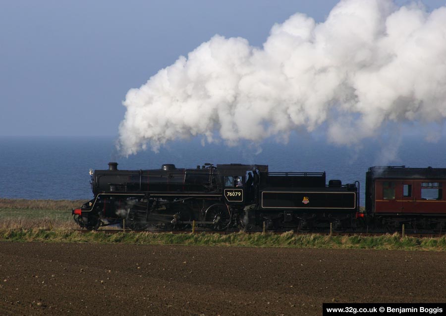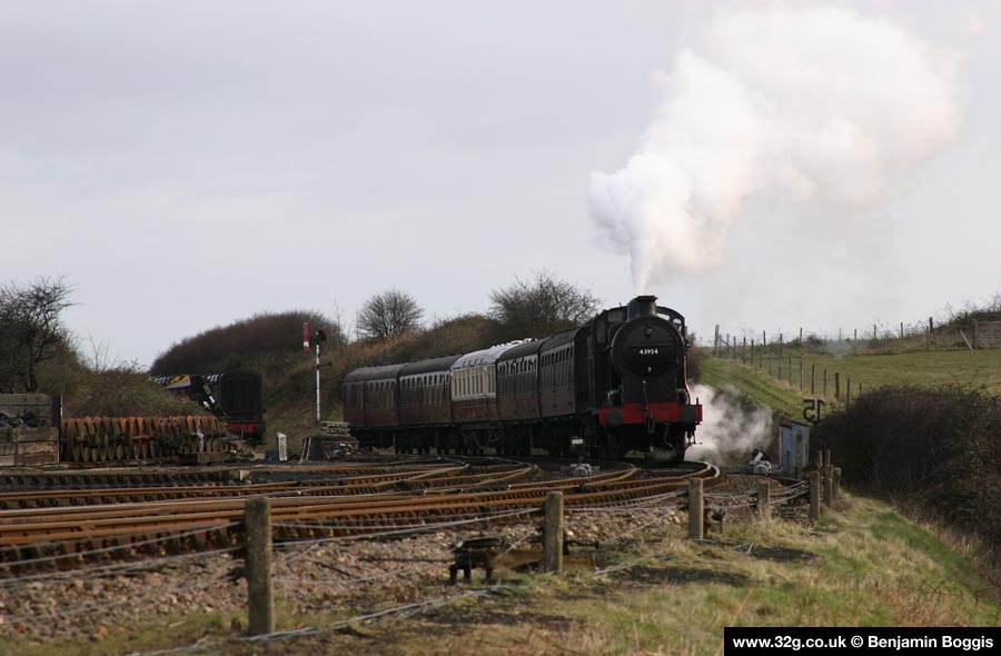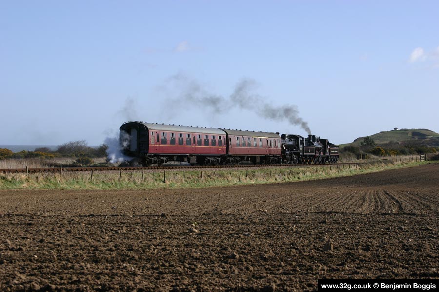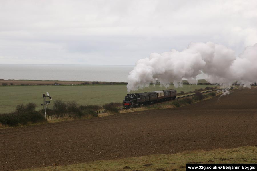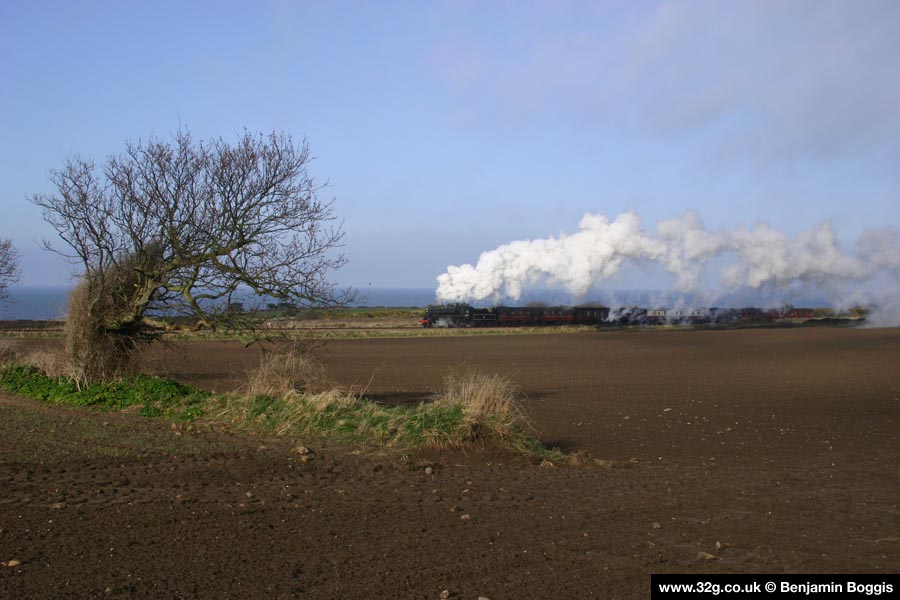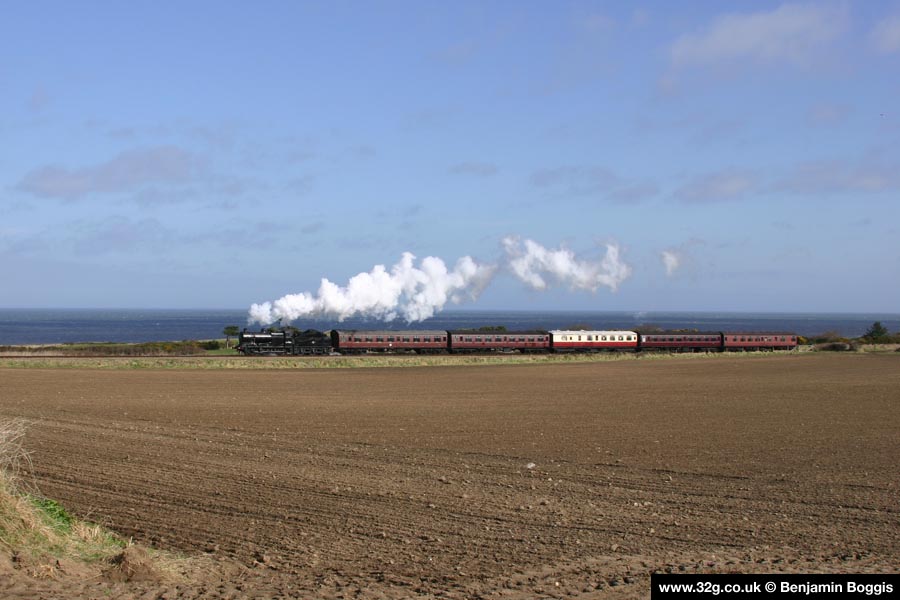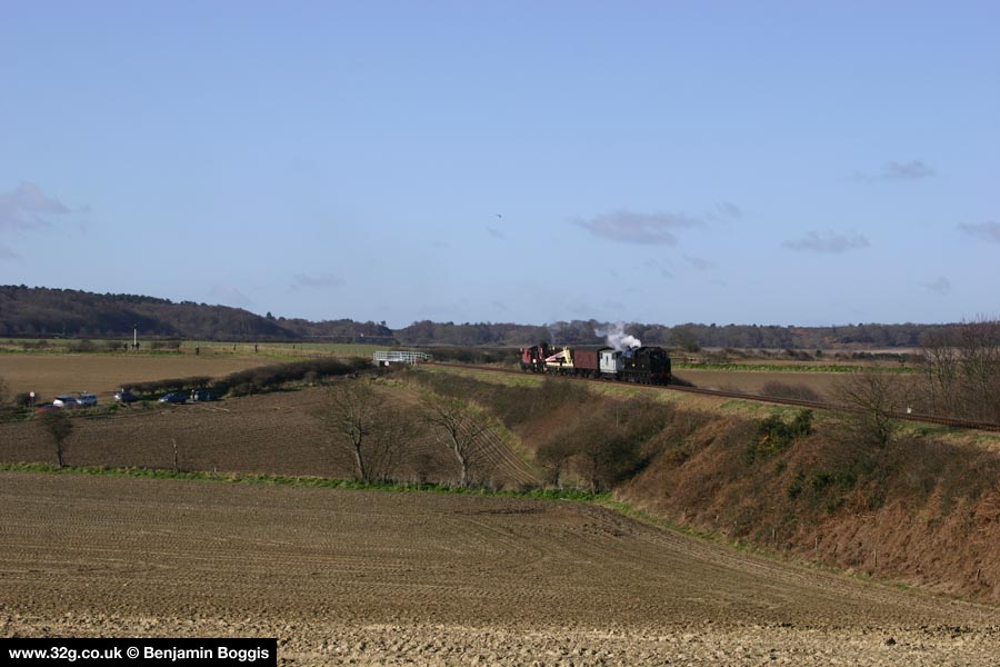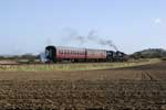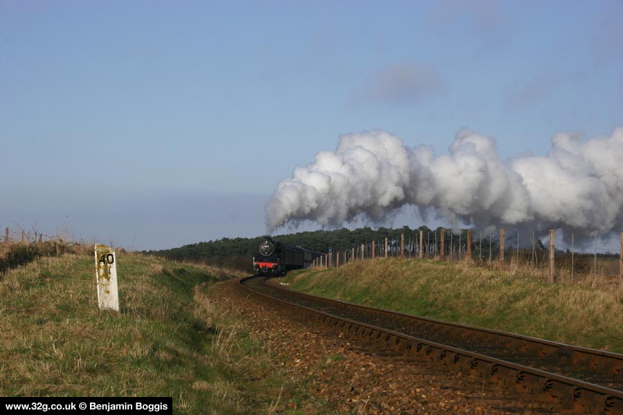 | Ian Bowskill Photo Charters. Monday 9th March featured visiting 4F 44422 renumbered as Leicester's 43954 and paired with the NNR's Gresley Buffet car, giving a flavour of the Summer Saturday trains seen over the Joint. Tuesday 10th March saw 4MT 76079, firstly with the breakdown train and later with coaching stock. While not regulars, Standard 4s did occasionally make it onto the M&GN. | |||