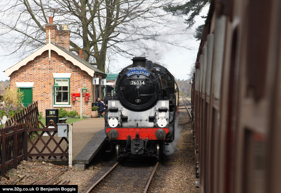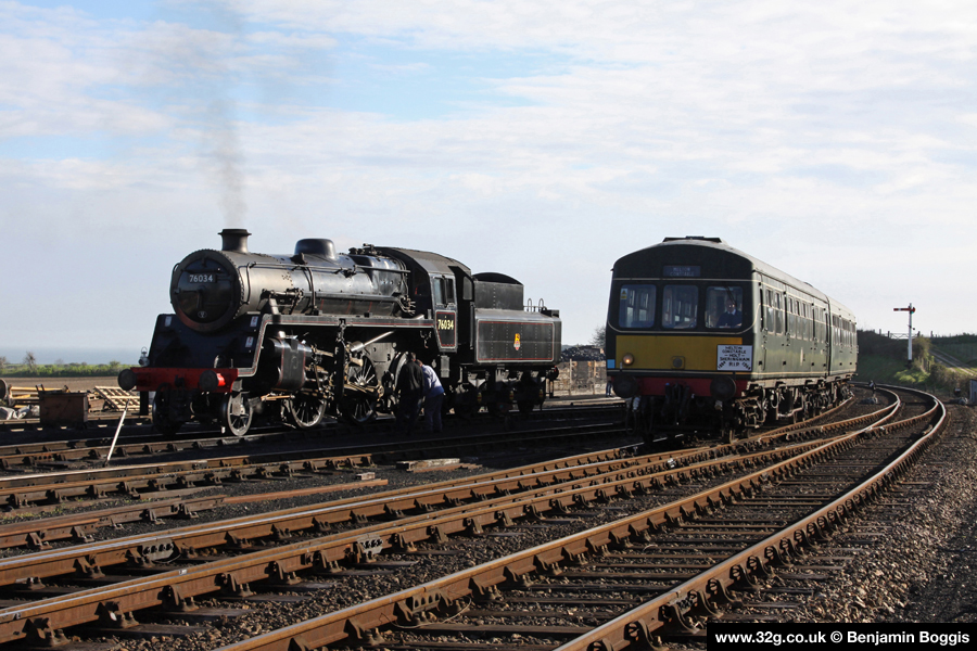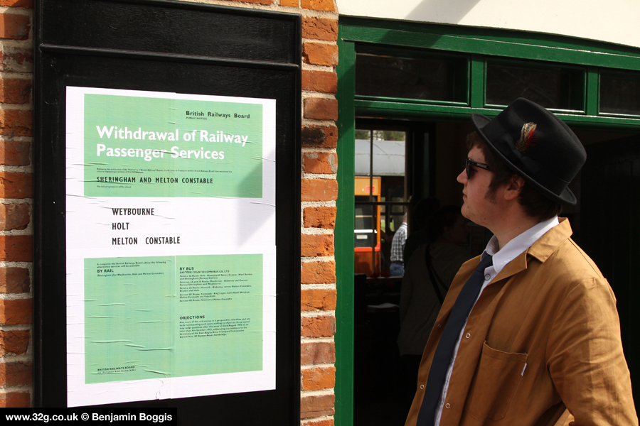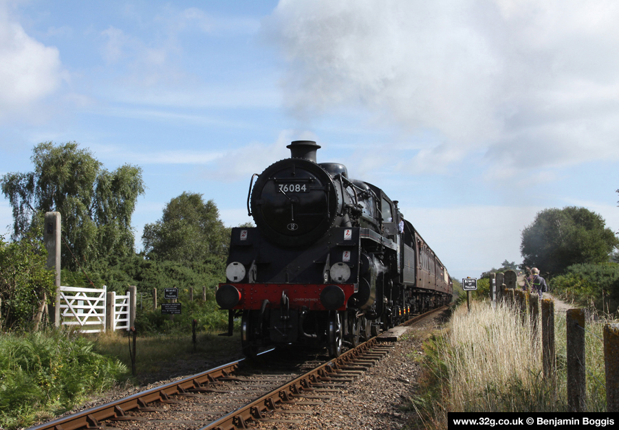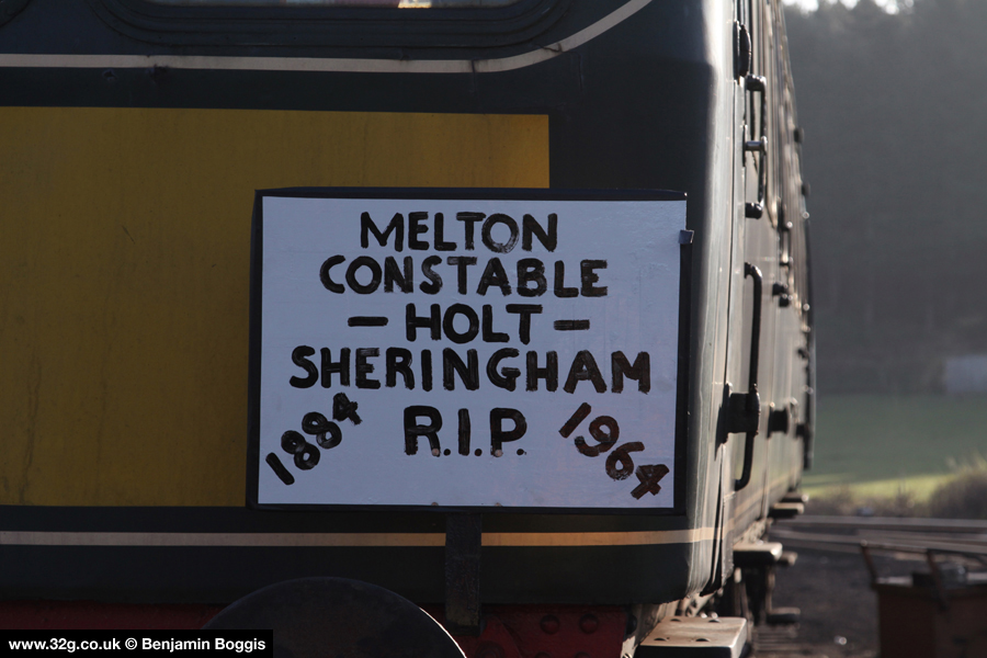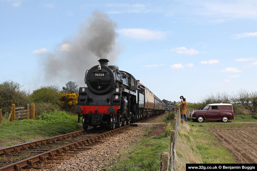 | On the 6th April 1964, the infamous 'Beeching Axle' fell on the M&GN's branch line from it's former engineering base at Melton Constable to Sheringham. That was suppose to be that, but part of the line was selected for preservation and today forms part of the North Norfolk Railway. To commemorate 50 years since the line's closure the NNR held a '60s Weekend' based around the 1964 timetable, featuring typical motive power from the final years of the line, including a ubiquitous Metro-Cammell DMU, a Brush Type 2 diesel and Standard 4MT 76084 (renumbered as 76034, one of the only members of the class to be recorded working over the line in BR days). | |||
